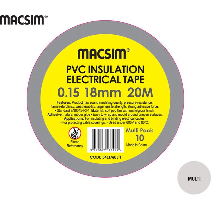 0.15 x 18mm x 20m PVC ELEC TAPE MULTI 10PK